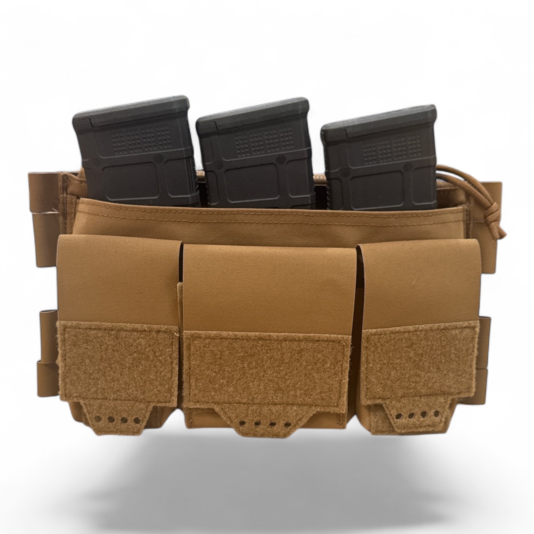 Engineered from 500D Nylon, this chest rig combines lightweight construction with tactical durability. Three flapped front pouches provide organized storage, each with a dedicated kangaroo pocket for immediate access to essentials. The center pouch includes a transparent 2"x3.5" window for quick-reference materials. A full-loop lined main cavity accepts modular inserts for mission-specific configuration, paired with an integrated 8.5"x5.5" zippered compartment. Ships with a factory three-mag 5.56 insert featuring positive magazine retention. Adjustable H-style shoulder straps and waist strap optimize load distribution, while quick-adjust hanger straps integrate seamlessly with plate carriers. Low-IR fabric and reinforced stress points deliver extended field performance. Mounts very easy to your plate carrier with our hanger adapter or full chest rig placard adapter kits sold separately.