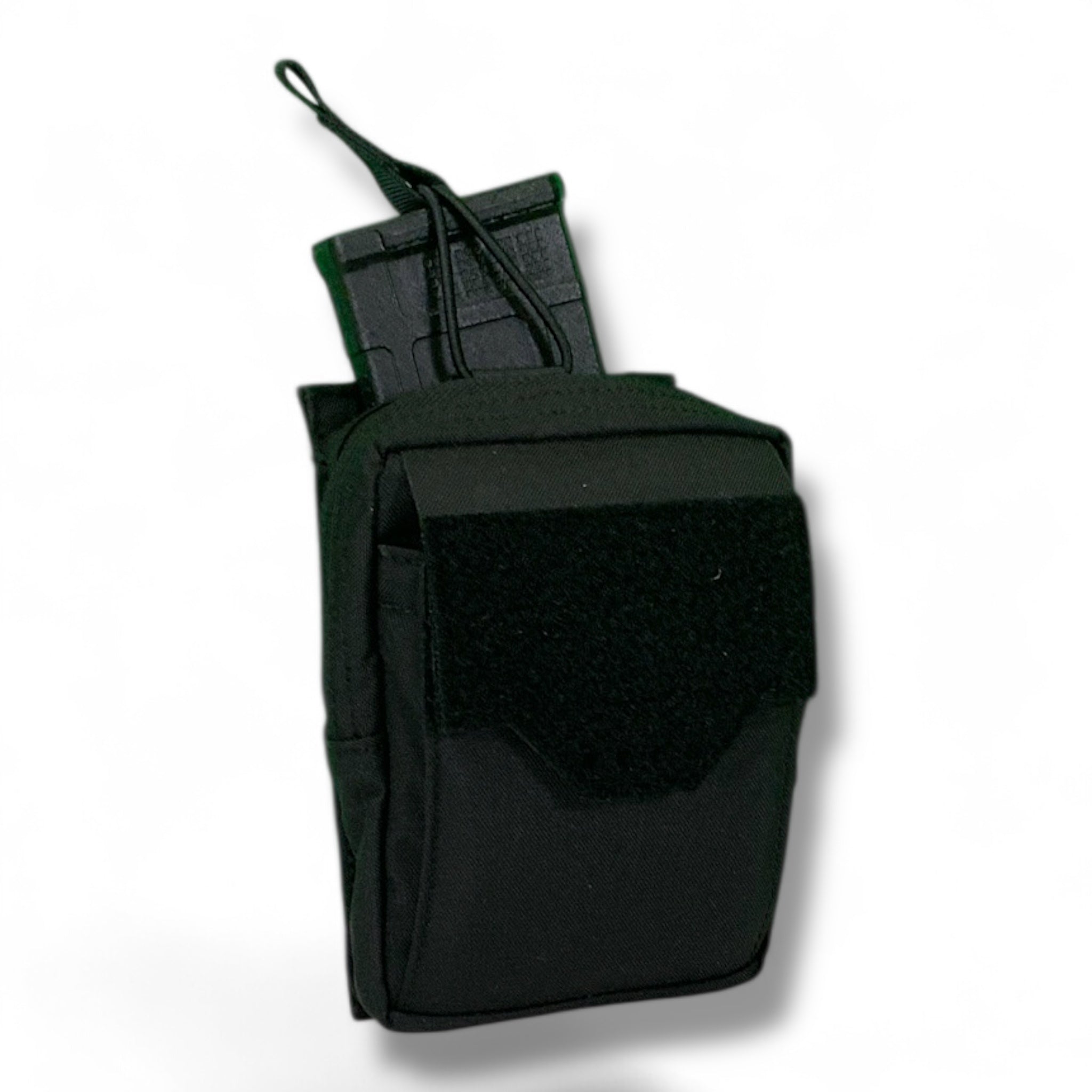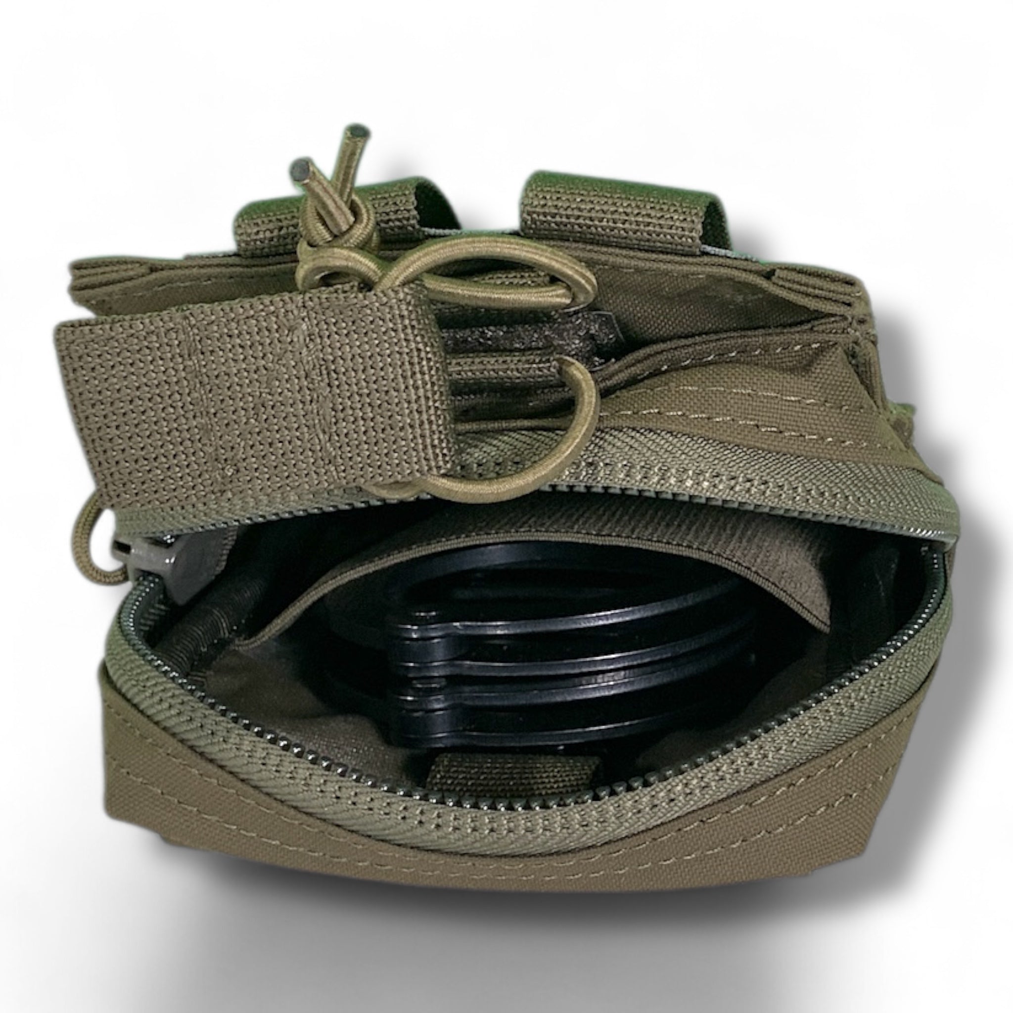 The Patrolman pouch is designed for today’s law enforcement professionals and tactical nylon users. Its slim profile fits securely on any PALS/MOLLE system with a 4x3 footprint. The front compartment includes two internal sections—one sized for small notebooks or gloves, and another for linked standard handcuffs—angled to reduce bulk and allow easy access when worn low on the belt. Exterior loop velcro accommodates ID patches, while a heavy-duty #10 YKK silent zipper ensures quiet, reliable opening and closing in low-light environments. Inside, there’s an additional handcuff pocket, a sewn-in HK-style clip for keys or similar items, plus a flat pouch for administrative gear. The top features a four-inch slot with a bungee cord to secure a modern phone or spare long rifle magazine. .