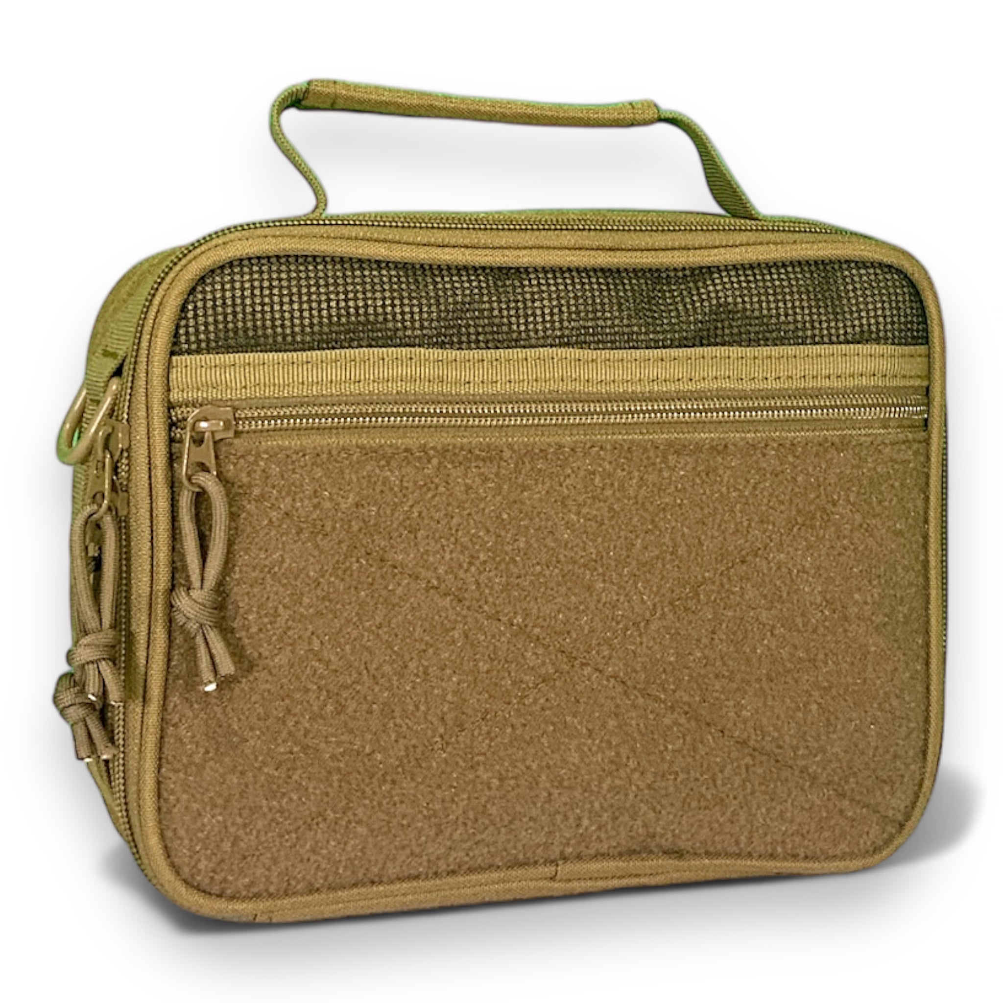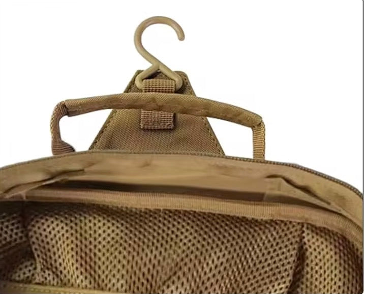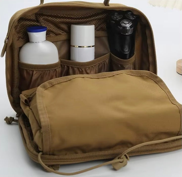 The R&S Tactical Gear The Tac Toiletry Bag. Yea its a stupid name, But we need these. If you have been on ship or at Camp Wilson you will know how valuable these are. Well we made it for whatever gender needs to bring items to the head with them. Space for just about everything and folds up like you would expect it to. Easy to pack and unpack. Does have a cool hanger built in as well. Coyote brown with loop fabric front and back to add your cool guy patches and to pet like a dog. Just the perfect hanging toiletry bag.