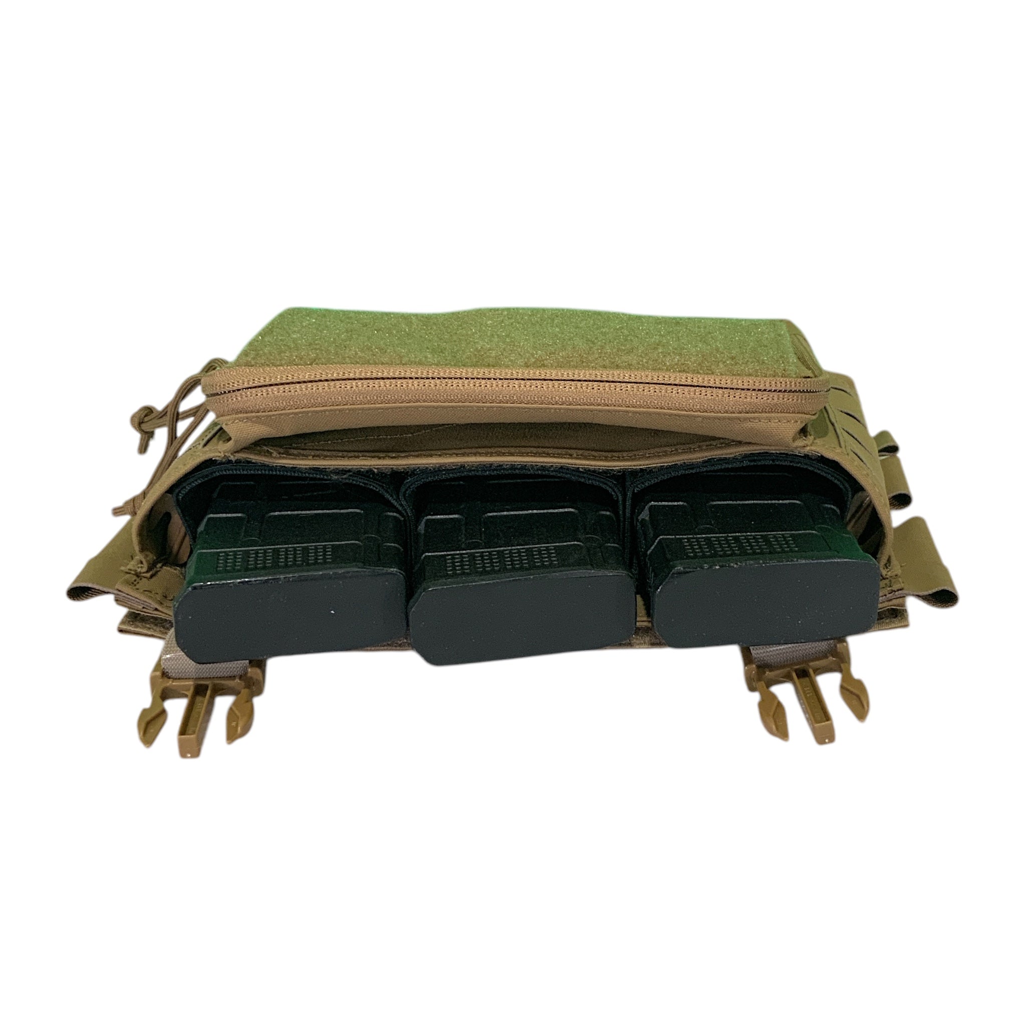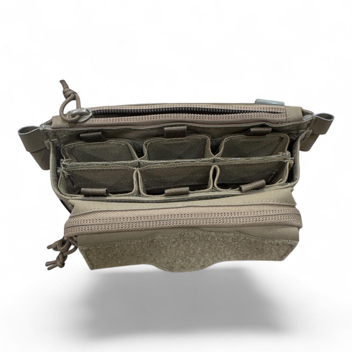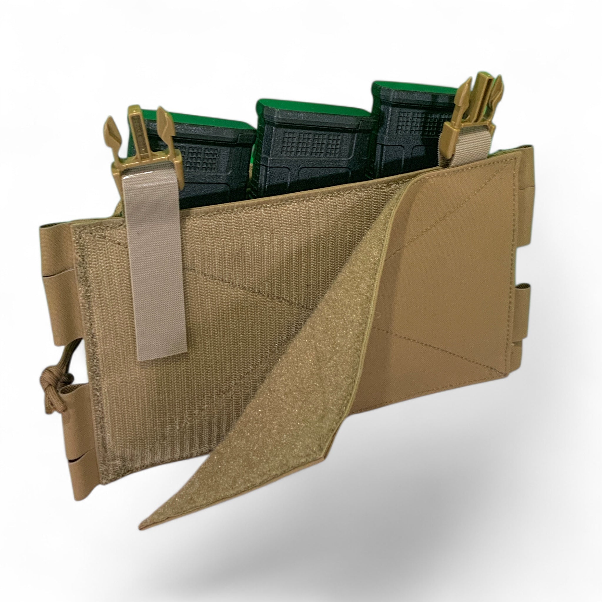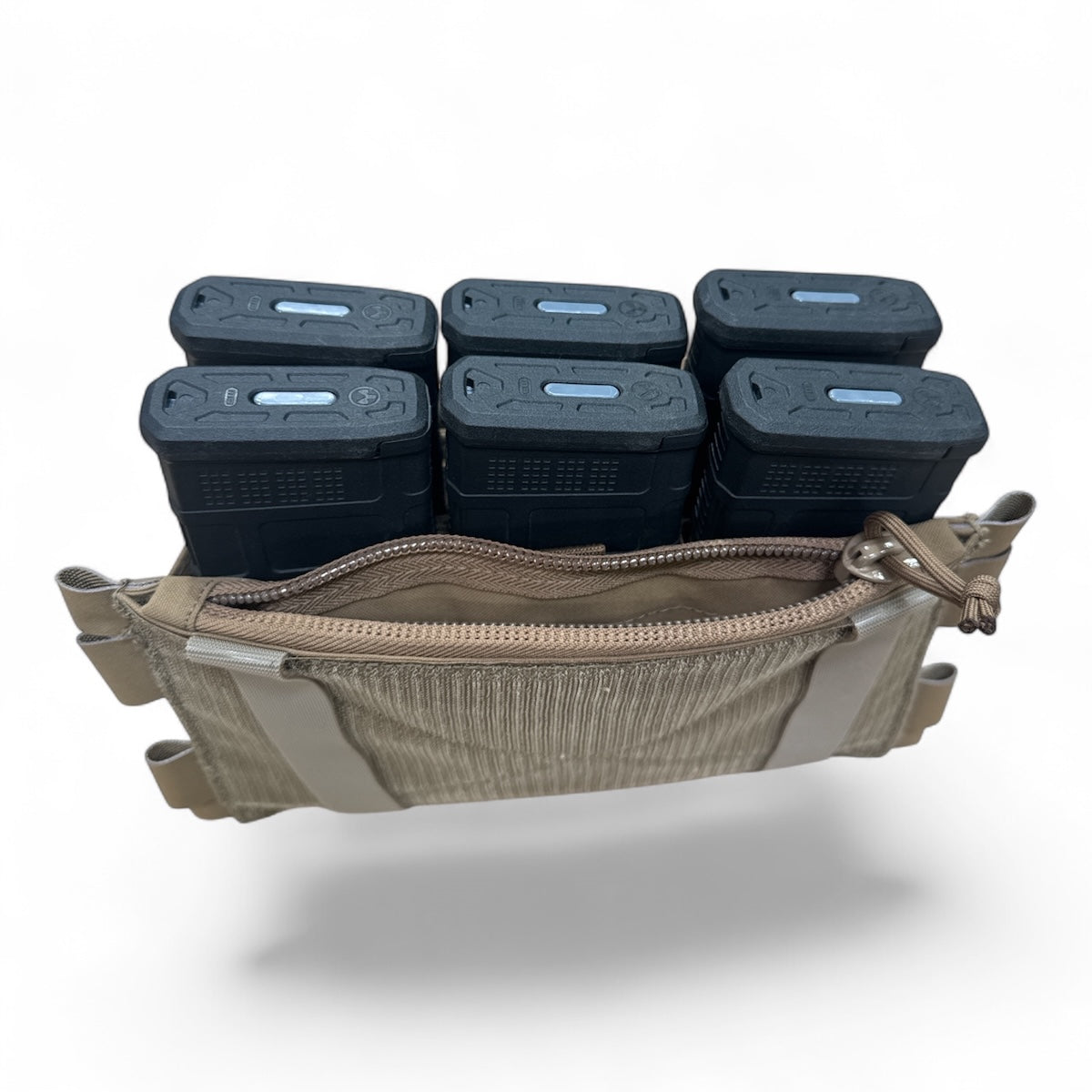 The Mini Variable Three or Six mag Loadout Rig is designed with 500D Nylon for its lightweight and durable properties. The front of the rig features an admin pouch with two elastic bands and a dummy cording loop, while the other side has a clear window for cheat cards or quick reference cards sized at 4.5" x 3". The rig's dual zippers allow easy access, and its laser cut pals on the left and right sides provide convenient attachment points for modular pouches or quick grab items. Additionally, there is a small kangaroo pouch that measures 6.5" x 4.5" in between the admin pouch and the mag cavity. The main internal cavity is lined with loop fabric, allowing for customization with your choice of insert. Each rig comes standard with a removable Six-mag 5.56 insert that securely locks your magazines in place. For added convenience, the rig comes with H style shoulder straps and a waist strap, as well as our plate carrier hanger adapter for easy mounting to your plate carrier. Low IR fabrics and double tacked at each stress point for longevity and strength. Mount your quick detach buckles directly to the rig for the best fit and security. This rig comes with everything you need to mount to your carrier or to wear as a chest rig out of the bag!