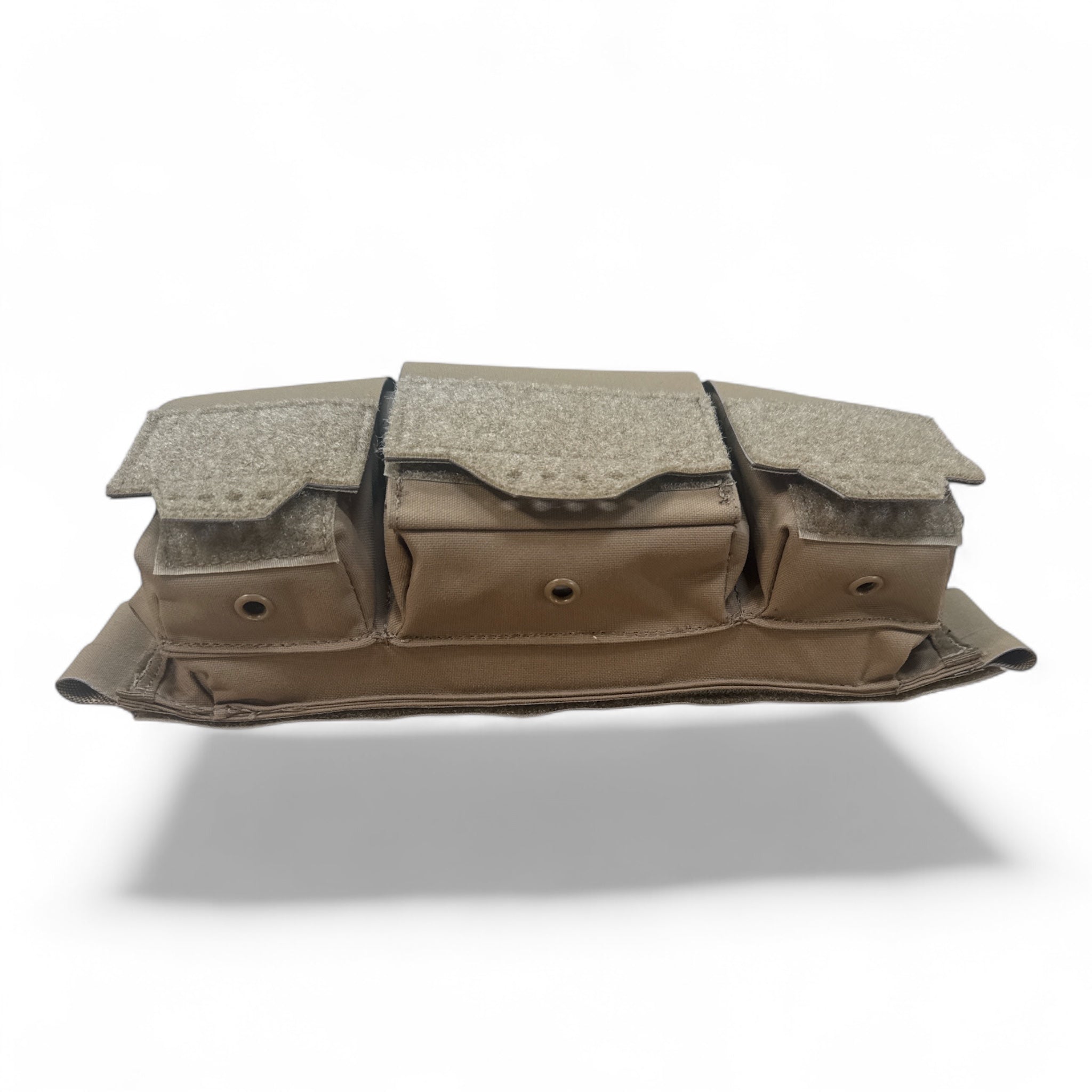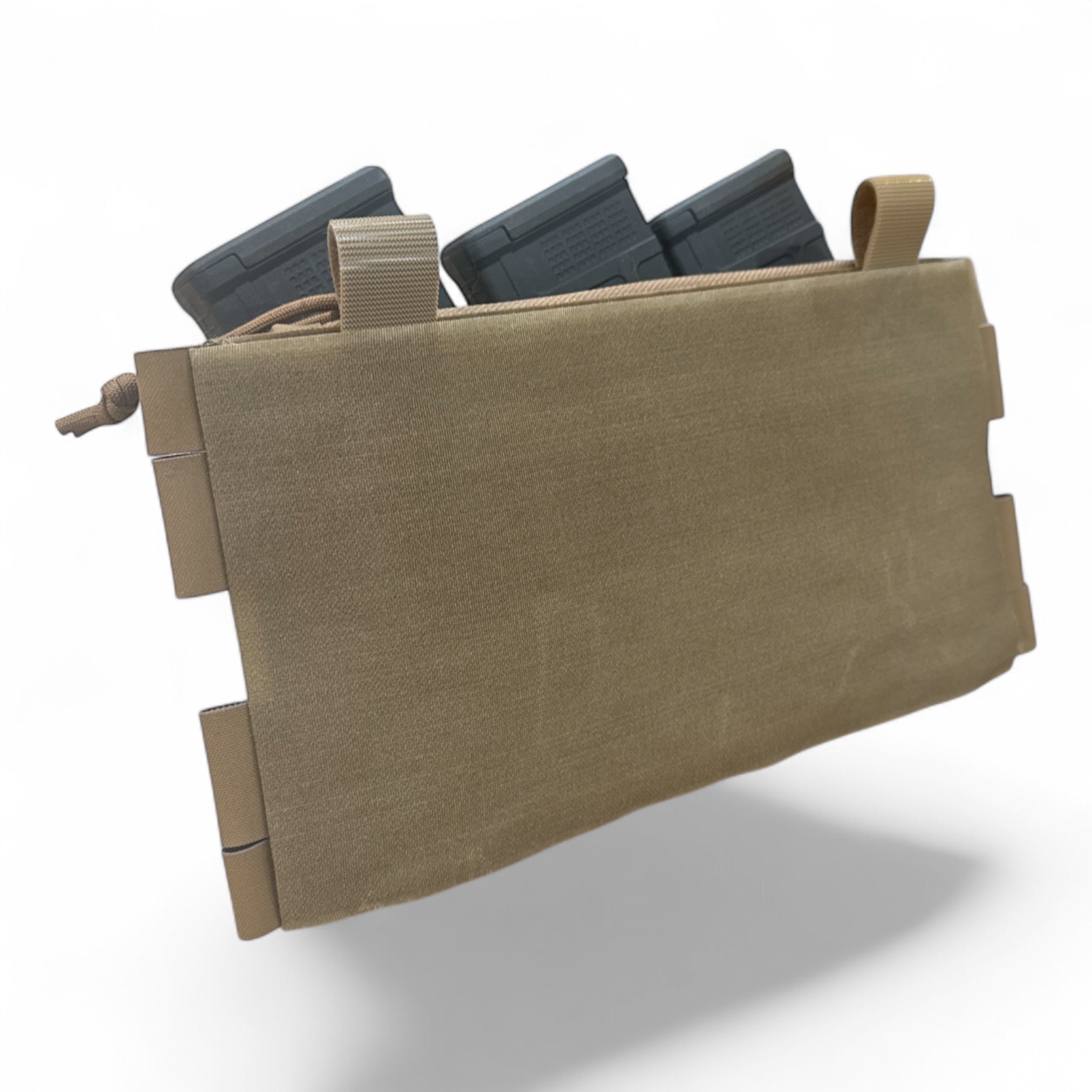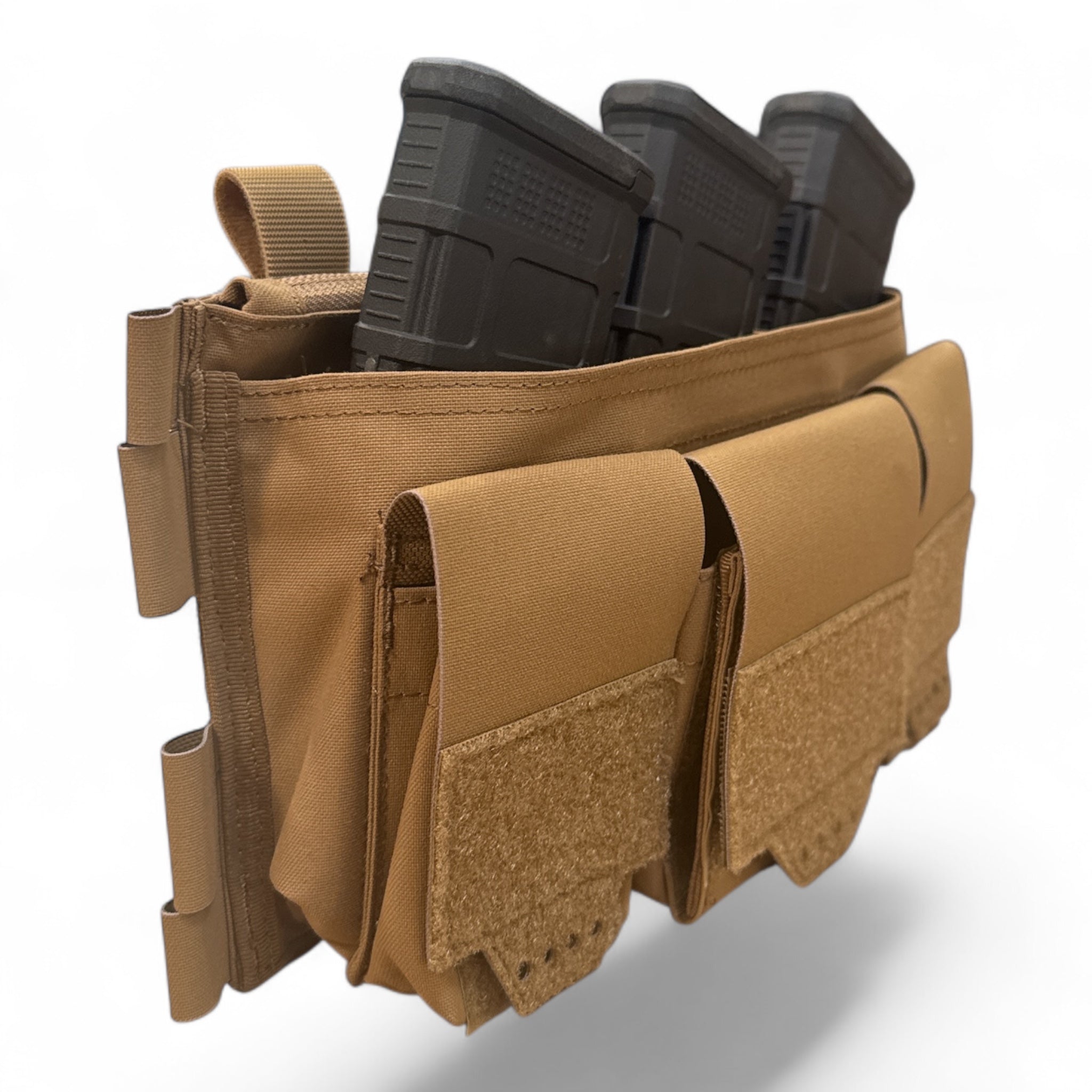 Engineered from 500D Nylon, this chest rig combines lightweight construction with tactical durability. Three flapped front pouches provide organized storage, each with a dedicated kangaroo pocket for immediate access to essentials. The center pouch includes a transparent 2"x3.5" window for quick-reference materials. A full-loop lined main cavity accepts modular inserts for mission-specific configuration, paired with an integrated 8.5"x5.5" zippered compartment. Ships with a factory three-mag 5.56 insert featuring positive magazine retention. Adjustable H-style shoulder straps and waist strap optimize load distribution, while quick-adjust hanger straps integrate seamlessly with plate carriers. Low-IR fabric and reinforced stress points deliver extended field performance. Mounts very easy to your plate carrier with our hanger adapter or full chest rig placard adapter kits sold separately.