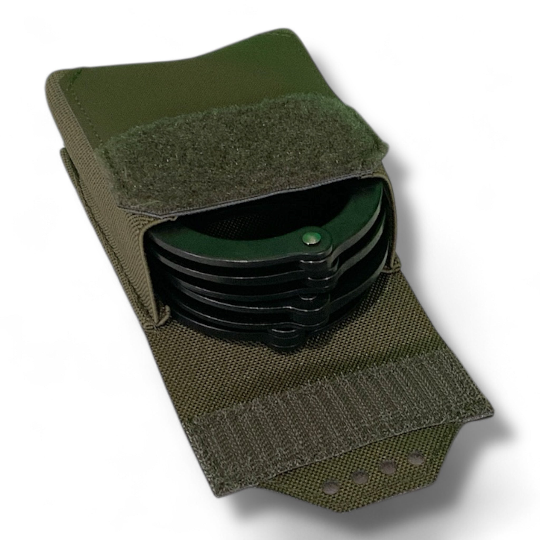 The modular handcuff pouch is built to hold one or two sets of chain linked standard handcuffs. This pouch will also hold up one ASP Branded Style cuffs. The laser cut lid gives the pouch a sleek and easy to grab lid that secures with hook and loop velcro brand fastener. This pouch is built to mount vertical to any PALS / MOLLE platform.