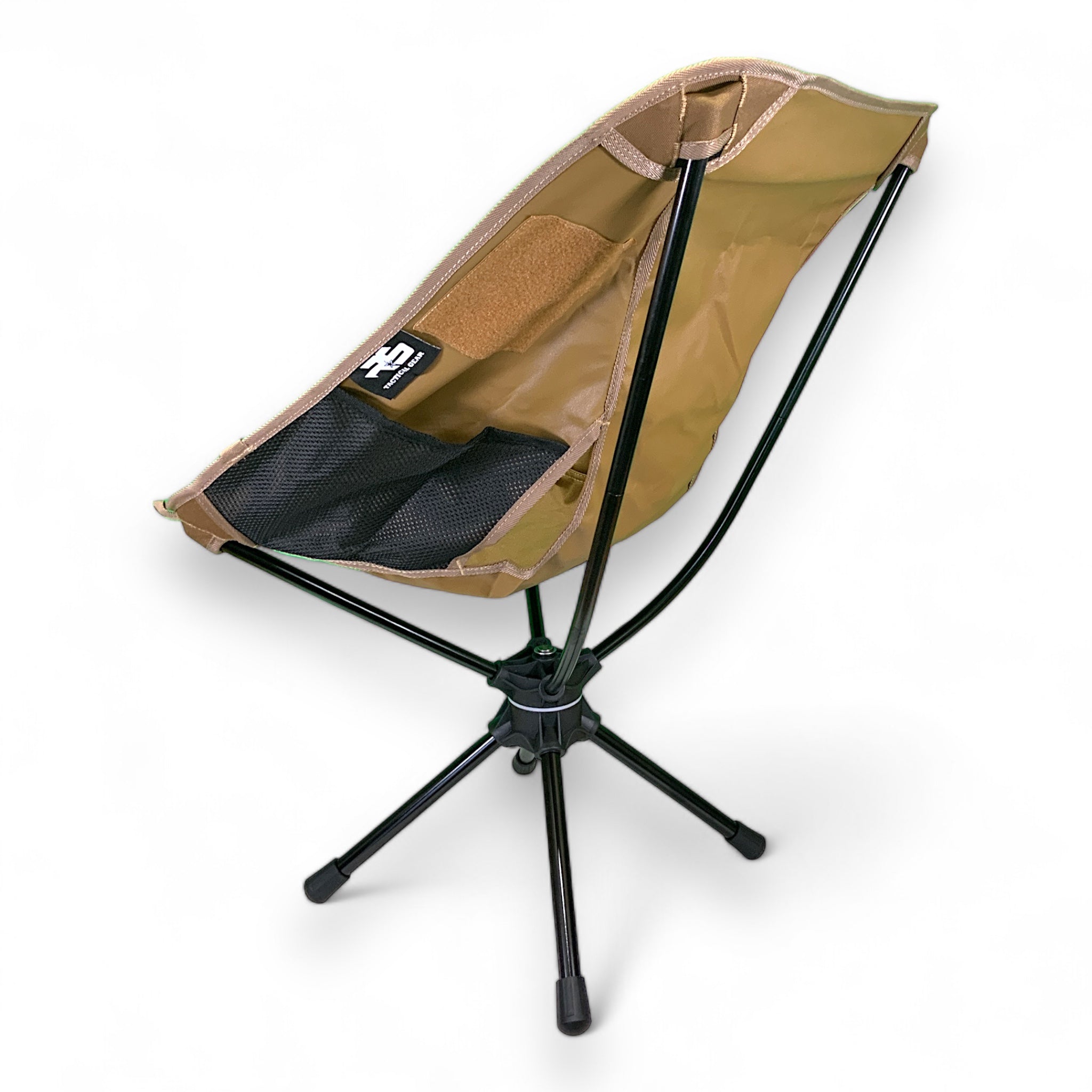 R&S Tactical Gear Tac Chair Lite is made from 600D polyester which is durable enough to handle your ass in this chair. Shock-corded poles lock the frame into place, Weighs 2 lbs 5 oz when packed up and can hold up to 265 lbs. when assembled. Easy to pack in your ruck and comes with a coyote brown carrying case. Loop fabric on both right and left sides for moral patches. Sitting at the barracks or in the field this chair is much better then sitting in the dirt. Its comfy as hell too.