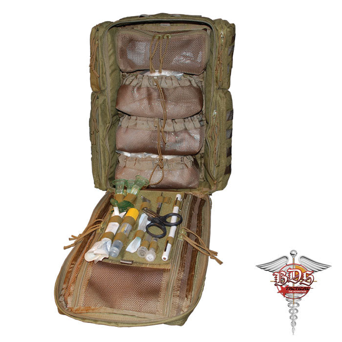 The BDS Tactical Gear Enhanced Combat Trauma Medical Bag has been designed and built from the ground up considering the specific needs of a Combat Medic. From the compartmentalized interior with airway panel to the external IV pouches on each side this bag can be set up to quickly access those life saving tools that are most often needed in combat. Each ECTAB has (1) zippered and (3) drawstring closure pouches that are fully removable from the back wall of the CTAB. As an option when configuring your bag, you may upgrade all of the pouches so that they have zipper closures. ZIPPERED POUCHES ARE MADE WITH ONE ZIPPER HEAD.The airway panel is also fully removable from the wall of the ECTAB and is mounted via hook / loop to the large zippered internal compartment. Each ECTAB is built with standard with (2) 500ml IV pouches and (2) 1000ml IV pouches. These pouches are mounted permanently on each side of the CTAB and they are covered in PALS webbing so that smaller pouches or tools can be attached. IV POUCHES ARE MADE WITH A SINGLE ZIPPER HEAD. The ECTAB also has two large 9x8x3 pouches on the front of the bag for even more storage. AND they are covered in PALS webbing so that even more smaller pouches or tools can be added.Because we understand that medics need multiple carry options (carried on back or mounted to a vehicle), we have designed these bags with back pack straps and we include shorter straps at the top of each bag with quick release buckles so that the bag can be vehicle mounted. As with all BDS Tactical Gear products, we use only 1000 Denier Cordura, heavy duty webbing, and high quality hook and loop material. All BDS Tactical Gear products are made in Oceanside, CA and carry our lifetime warranty!